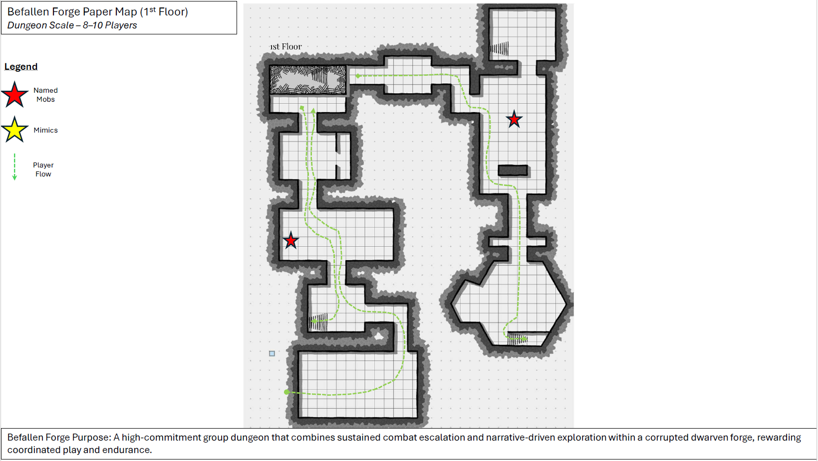 Befallen Forge is a large-scale group dungeon in the Riverlands, built as a high-commitment combat and exploration experience for coordinated parties of 8–10 players. Set within a ruined dwarven forge corrupted during the Great War of the Undying, the dungeon challenges players through prolonged engagement, layered encounter density, and environmental storytelling rooted in industrial collapse and undeath.